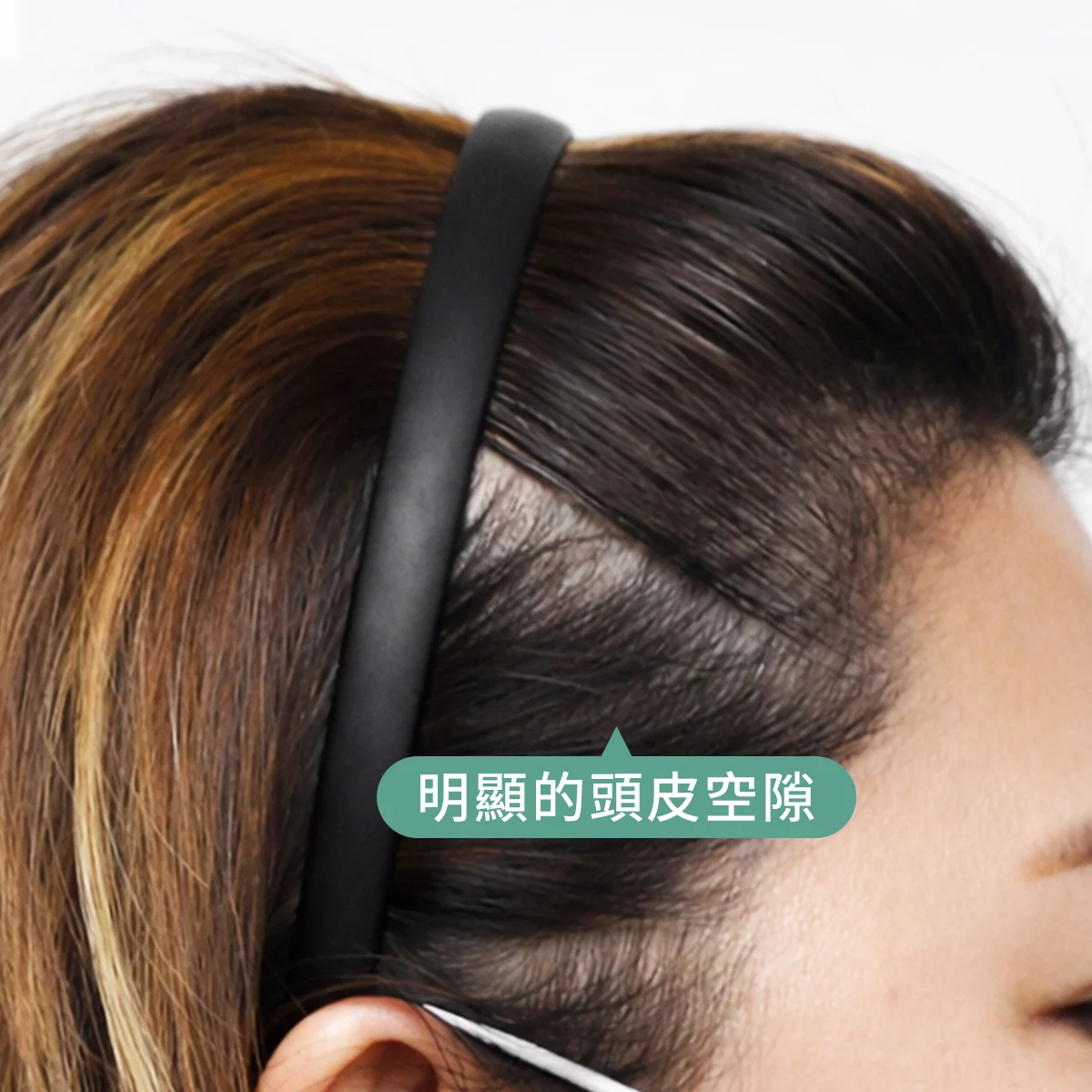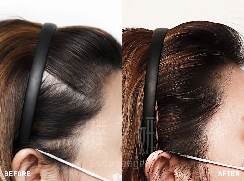 第二,也是最讓我困擾的,是戴上髮箍的時候。以前戴髮箍是為了造型,現在戴髮箍卻成了一種考驗。每當我把頭髮全部往後箍,鬢角上方和頭頂側邊就會露出幾塊明顯的頭皮空隙(就像對比照左邊那樣)。那種感覺就像是精緻的妝容上多了幾道瑕疵,讓我總覺得整個人顯得疲憊、甚至帶點「滄桑感」。