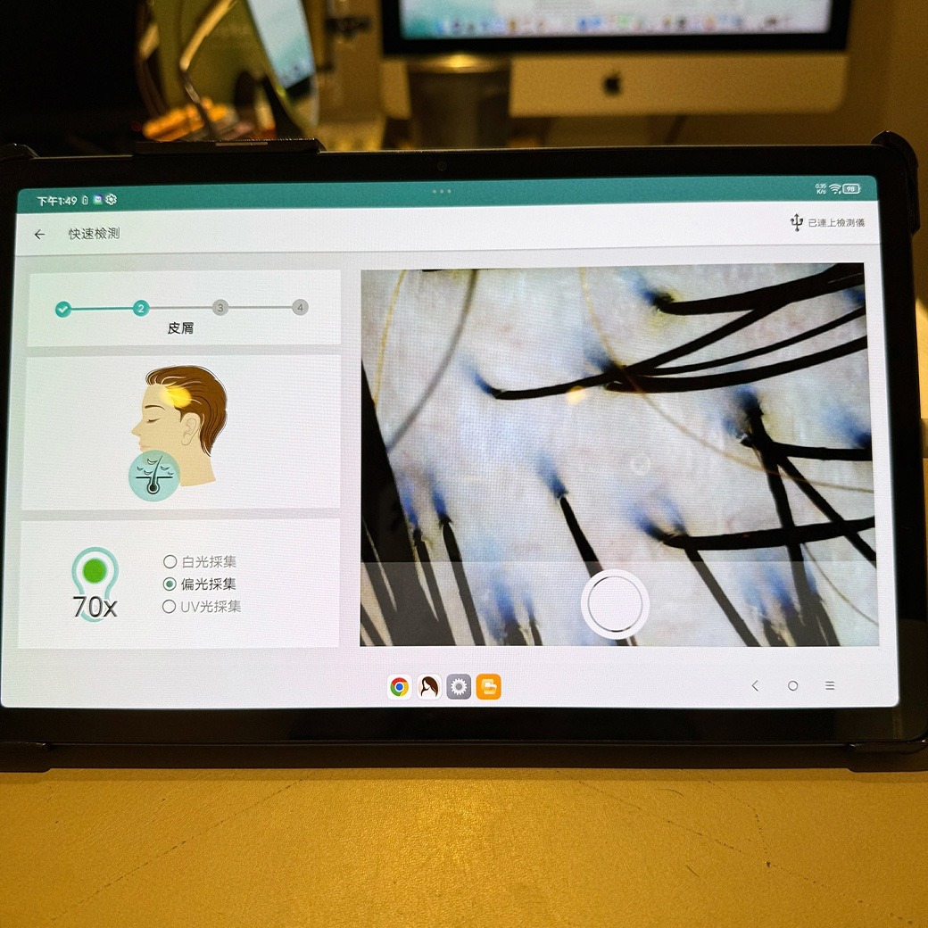 每一次療程前,醫師都會先透過頭皮檢測儀進行詳細分析,包含毛孔乾淨度、油脂分泌狀況、髮量密度,以及頭皮是否處於敏感或發炎狀態。這樣的檢測,讓原本只能「憑感覺」判斷的問題,轉化為清楚可視的數據依據。