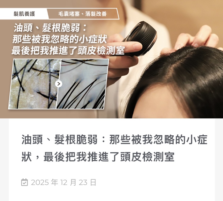 頭皮診療過程中,多數患者的頭皮有油脂阻塞、毛囊炎等現象,原因之一就是髮品清潔不當。例如潤髮與護髮產品成分中的矽靈與油脂雖會讓髮絲柔順好整理,但對於頭皮而言卻是沉重的負擔;染燙髮的化學藥劑殘留於頭皮更會導致皮膚敏感,產生紅腫與刺痛。摩托車騎士在交通途中長時間戴安全帽,皮脂與汗水在高溫的環境下殘留於頭皮,這些角質污垢的堆積都不利於頭皮健康。